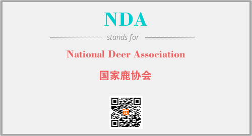 英文缩略词“NDA”经常作为“National Deer Association”的英文缩写来使用,中文表示:“国家鹿协会”。本文将详细介绍英文缩写词NDA所代表英文单词,其对应的中文拼音、详细解释以及在英语中的流行度。此外,还有关于缩略词NDA的分类、应用领域及相关应用示例等。