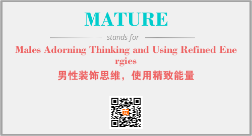 上述内容是“Males Adorning Thinking and Using Refined Energies”作为“MATURE”的缩写,解释为“男性装饰思维,使用精致能量”时的信息,以及英文缩略词MATURE所代表的英文单词,其对应的中文拼音、详细解释以及在英文中的流行度和相关分类、应用领域及应用示例等。