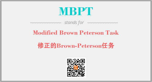 上述内容是“Modified Brown Peterson Task”作为“MBPT”的缩写,解释为“修正的Brown-Peterson任务”时的信息,以及英文缩略词MBPT所代表的英文单词,其对应的中文拼音、详细解释以及在英文中的流行度和相关分类、应用领域及应用示例等。