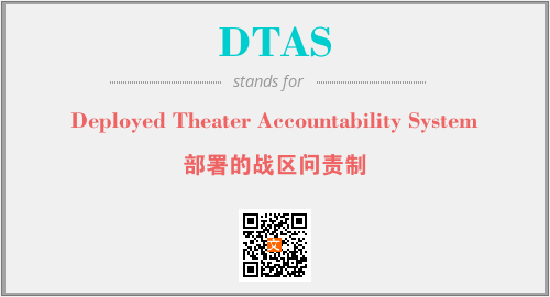 上述内容是“Deployed Theater Accountability System”作为“DTAS”的缩写,解释为“部署的战区问责制”时的信息,以及英文缩略词DTAS所代表的英文单词,其对应的中文拼音、详细解释以及在英文中的流行度和相关分类、应用领域及应用示例等。