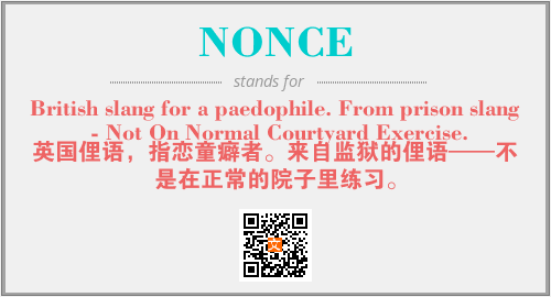 上述内容是“British slang for a paedophile. From prison slang - Not On Normal Courtyard Exercise.”作为“NONCE”的缩写,解释为“英国俚语,指恋童癖者。来自监狱的俚语——不是在正常的院子里练习。”时的信息,以及英文缩略词NONCE所代表的英文单词,其对应的中文拼音、详细解释以及在英文中的流行度和相关分类、应用领域及应用示例等。