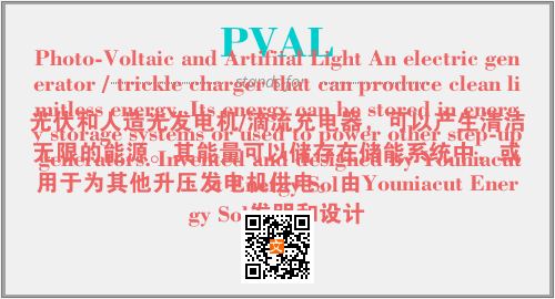 "PVAL - 光伏和人造光发电机/滴流充电器,可以产生清洁无限的能源。其能量可以储存在储能系统中,或用于为其他升压发电机供电。由Youniacut Energy Sol发明和设计 ." [引用日期]. <https://www.suoxie123.com/a/6567F.html>.