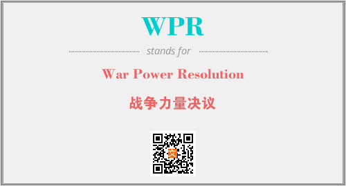 上述内容是“War Power Resolution”作为“WPR”的缩写,解释为“战争力量决议”时的信息,以及英文缩略词WPR所代表的英文单词,其对应的中文拼音、详细解释以及在英文中的流行度和相关分类、应用领域及应用示例等。