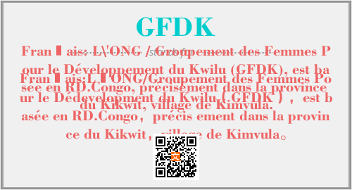上述内容是“Français: L\'ONG / Groupement des Femmes Pour le Développement du Kwilu (GFDK), est basée en RD.Congo, précisément dans la province du Kikwit, village de Kimvula.”作为“GFDK”的缩写,解释为“Français:LãONG/Groupement des Femmes Pour le Dédevelopment du Kwilu(GFDK),est basée en RD.Congo,précis ement dans la province du Kikwit,village de Kimvula。”时的信息,以及英文缩略词GFDK所代表的英文单词,其对应的中文拼音、详细解释以及在英文中的流行度和相关分类、应用领域及应用示例等。