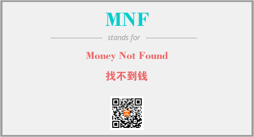 上述内容是“Money Not Found”作为“MNF”的缩写,解释为“找不到钱”时的信息,以及英文缩略词MNF所代表的英文单词,其对应的中文拼音、详细解释以及在英文中的流行度和相关分类、应用领域及应用示例等。