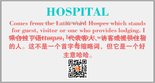 "HOSPITAL - 来自拉丁语Hospes,代表客人、访客或提供住宿的人。这不是一个首字母缩略词,但它是一个好主意哈哈。 ." [引用日期]. <https://www.suoxie123.com/a/65BA2.html>.