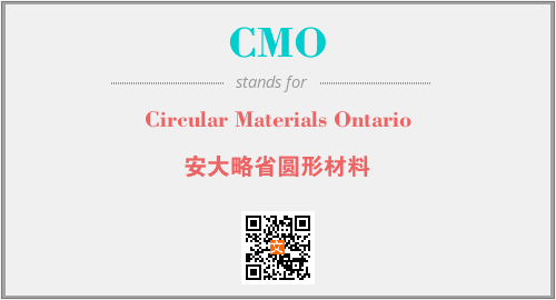 上述内容是“Circular Materials Ontario”作为“CMO”的缩写,解释为“安大略省圆形材料”时的信息,以及英文缩略词CMO所代表的英文单词,其对应的中文拼音、详细解释以及在英文中的流行度和相关分类、应用领域及应用示例等。