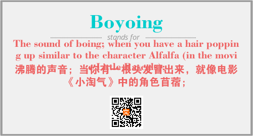 以上为The sound of boing; when you have a hair popping up similar to the character Alfalfa (in the movie Little Rascals);英文缩略词Boyoing的中文解释,以及该英文缩写在英语的流行度、分类和应用领域方面的信息。
