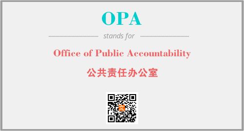 上述内容是“Office of Public Accountability”作为“OPA”的缩写,解释为“公共责任办公室”时的信息,以及英文缩略词OPA所代表的英文单词,其对应的中文拼音、详细解释以及在英文中的流行度和相关分类、应用领域及应用示例等。