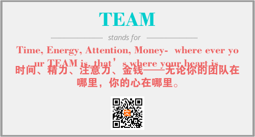 上述内容是“Time, Energy, Attention, Money- where ever your TEAM is, that’s where your heart is.”作为“TEAM”的缩写,解释为“时间、精力、注意力、金钱——无论你的团队在哪里,你的心在哪里。”时的信息,以及英文缩略词TEAM所代表的英文单词,其对应的中文拼音、详细解释以及在英文中的流行度和相关分类、应用领域及应用示例等。