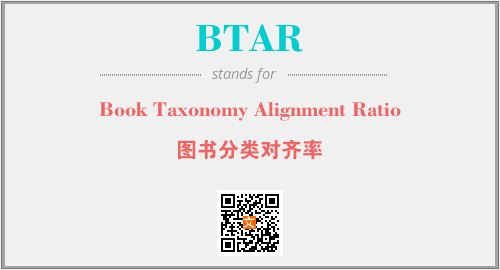 上述内容是“Book Taxonomy Alignment Ratio”作为“BTAR”的缩写,解释为“图书分类对齐率”时的信息,以及英文缩略词BTAR所代表的英文单词,其对应的中文拼音、详细解释以及在英文中的流行度和相关分类、应用领域及应用示例等。