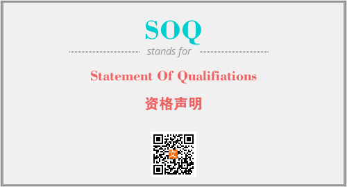 以上为Statement Of Qualifiations英文缩略词SOQ的中文解释,以及该英文缩写在英语的流行度、分类和应用领域方面的信息。