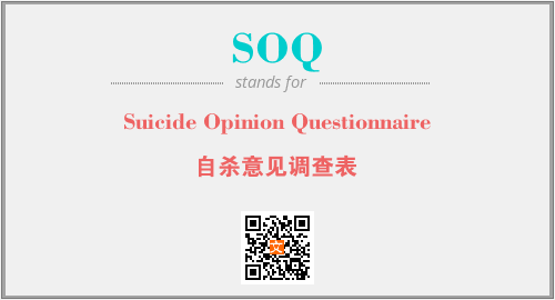 上述内容是“Suicide Opinion Questionnaire”作为“SOQ”的缩写,解释为“自杀意见调查表”时的信息,以及英文缩略词SOQ所代表的英文单词,其对应的中文拼音、详细解释以及在英文中的流行度和相关分类、应用领域及应用示例等。