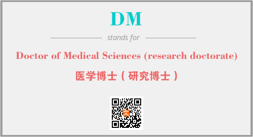 上述内容是“Doctor of Medical Sciences (research doctorate)”作为“DM”的缩写,解释为“医学博士(研究博士)”时的信息,以及英文缩略词DM所代表的英文单词,其对应的中文拼音、详细解释以及在英文中的流行度和相关分类、应用领域及应用示例等。