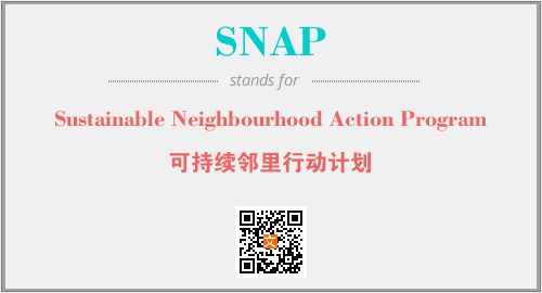 上述内容是“Sustainable Neighbourhood Action Program”作为“SNAP”的缩写,解释为“可持续邻里行动计划”时的信息,以及英文缩略词SNAP所代表的英文单词,其对应的中文拼音、详细解释以及在英文中的流行度和相关分类、应用领域及应用示例等。