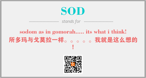 上述内容是“sodom as in gomorah..... its what i think!”作为“SOD”的缩写,解释为“所多玛与戈莫拉一样。。。。。我就是这么想的!”时的信息,以及英文缩略词SOD所代表的英文单词,其对应的中文拼音、详细解释以及在英文中的流行度和相关分类、应用领域及应用示例等。