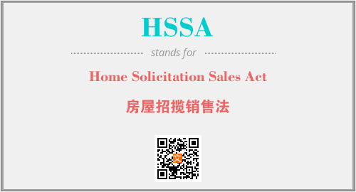 上述内容是“Home Solicitation Sales Act”作为“HSSA”的缩写,解释为“房屋招揽销售法”时的信息,以及英文缩略词HSSA所代表的英文单词,其对应的中文拼音、详细解释以及在英文中的流行度和相关分类、应用领域及应用示例等。