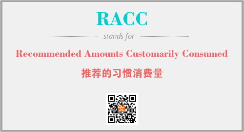 上述内容是“Recommended Amounts Customarily Consumed”作为“RACC”的缩写,解释为“推荐的习惯消费量”时的信息,以及英文缩略词RACC所代表的英文单词,其对应的中文拼音、详细解释以及在英文中的流行度和相关分类、应用领域及应用示例等。
