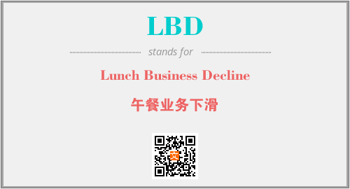 上述内容是“Lunch Business Decline”作为“LBD”的缩写,解释为“午餐业务下滑”时的信息,以及英文缩略词LBD所代表的英文单词,其对应的中文拼音、详细解释以及在英文中的流行度和相关分类、应用领域及应用示例等。