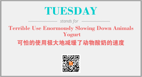 上述内容是“Terrible Use Enormously Slowing Down Animals Yogurt”作为“TUESDAY”的缩写,解释为“可怕的使用极大地减缓了动物酸奶的速度”时的信息,以及英文缩略词TUESDAY所代表的英文单词,其对应的中文拼音、详细解释以及在英文中的流行度和相关分类、应用领域及应用示例等。