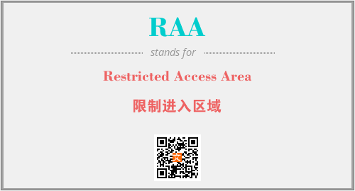 英文缩略词“RAA”经常作为“Restricted Access Area”的英文缩写来使用,中文表示:“限制进入区域”。本文将详细介绍英文缩写词RAA所代表英文单词,其对应的中文拼音、详细解释以及在英语中的流行度。此外,还有关于缩略词RAA的分类、应用领域及相关应用示例等。
