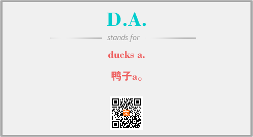 上述内容是“ducks a.”作为“D.A.”的缩写,解释为“鸭子a。”时的信息,以及英文缩略词D.A.所代表的英文单词,其对应的中文拼音、详细解释以及在英文中的流行度和相关分类、应用领域及应用示例等。