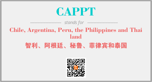 上述内容是“Chile, Argentina, Peru, the Philippines and Thailand”作为“CAPPT”的缩写,解释为“智利、阿根廷、秘鲁、菲律宾和泰国”时的信息,以及英文缩略词CAPPT所代表的英文单词,其对应的中文拼音、详细解释以及在英文中的流行度和相关分类、应用领域及应用示例等。