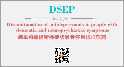 上述内容是“Discontinuation of antidepressants in people with dementia and neuropsychiatric symptoms”作为“DSEP”的缩写,解释为“痴呆和神经精神症状患者停用抗抑郁药”时的信息,以及英文缩略词DSEP所代表的英文单词,其对应的中文拼音、详细解释以及在英文中的流行度和相关分类、应用领域及应用示例等。