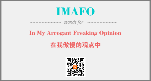 以上为In My Arrogant Freaking Opinion英文缩略词IMAFO的中文解释,以及该英文缩写在英语的流行度、分类和应用领域方面的信息。