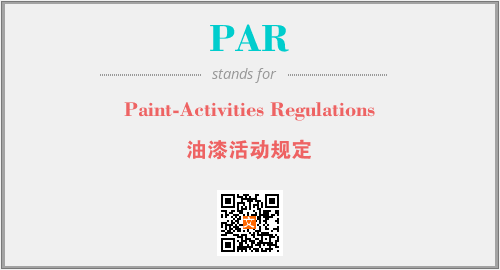 英文缩略词“PAR”经常作为“Paint-Activities Regulations”的英文缩写来使用,中文表示:“油漆活动规定”。本文将详细介绍英文缩写词PAR所代表英文单词,其对应的中文拼音、详细解释以及在英语中的流行度。此外,还有关于缩略词PAR的分类、应用领域及相关应用示例等。