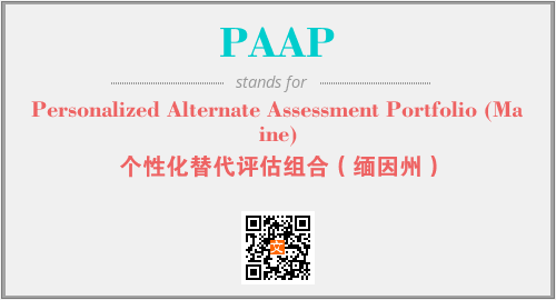 英文缩略词“PAAP”经常作为“Personalized Alternate Assessment Portfolio (Maine)”的英文缩写来使用,中文表示:“个性化替代评估组合(缅因州)”。本文将详细介绍英文缩写词PAAP所代表英文单词,其对应的中文拼音、详细解释以及在英语中的流行度。此外,还有关于缩略词PAAP的分类、应用领域及相关应用示例等。