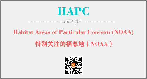 上述内容是“Habitat Areas of Particular Concern (NOAA)”作为“HAPC”的缩写,解释为“特别关注的栖息地(NOAA)”时的信息,以及英文缩略词HAPC所代表的英文单词,其对应的中文拼音、详细解释以及在英文中的流行度和相关分类、应用领域及应用示例等。