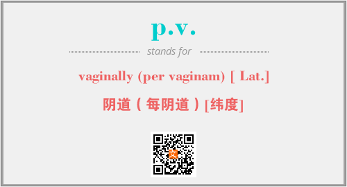 上述内容是“vaginally (per vaginam) [ Lat.]”作为“p.v.”的缩写,解释为“阴道(每阴道)[纬度]”时的信息,以及英文缩略词p.v.所代表的英文单词,其对应的中文拼音、详细解释以及在英文中的流行度和相关分类、应用领域及应用示例等。