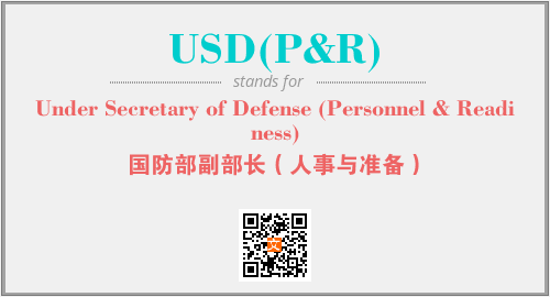 英文缩略词“USD(P&R)”经常作为“Under Secretary of Defense (Personnel & Readiness)”的英文缩写来使用,中文表示:“国防部副部长(人事与准备)”。本文将详细介绍英文缩写词USD(P&R)所代表英文单词,其对应的中文拼音、详细解释以及在英语中的流行度。此外,还有关于缩略词USD(P&R)的分类、应用领域及相关应用示例等。