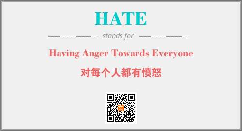上述内容是“Having Anger Towards Everyone”作为“HATE”的缩写,解释为“对每个人都有愤怒”时的信息,以及英文缩略词HATE所代表的英文单词,其对应的中文拼音、详细解释以及在英文中的流行度和相关分类、应用领域及应用示例等。