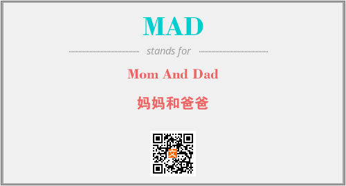 英文缩略词“MAD”经常作为“Mom And Dad”的英文缩写来使用,中文表示:“妈妈和爸爸”。本文将详细介绍英文缩写词MAD所代表英文单词,其对应的中文拼音、详细解释以及在英语中的流行度。此外,还有关于缩略词MAD的分类、应用领域及相关应用示例等。