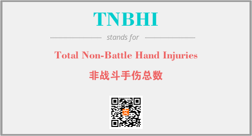 英文缩略词“TNBHI”经常作为“Total Non-Battle Hand Injuries”的英文缩写来使用,中文表示:“非战斗手伤总数”。本文将详细介绍英文缩写词TNBHI所代表英文单词,其对应的中文拼音、详细解释以及在英语中的流行度。此外,还有关于缩略词TNBHI的分类、应用领域及相关应用示例等。