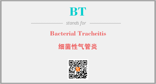 上述内容是“Bacterial Tracheitis”作为“BT”的缩写,解释为“细菌性气管炎”时的信息,以及英文缩略词BT所代表的英文单词,其对应的中文拼音、详细解释以及在英文中的流行度和相关分类、应用领域及应用示例等。