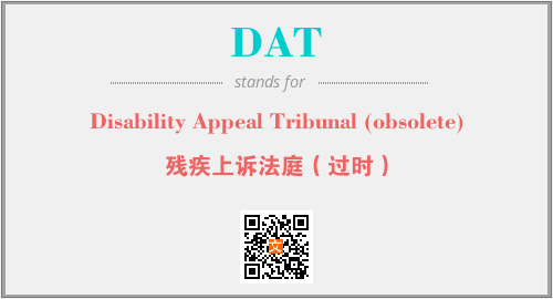 英文缩略词“DAT”经常作为“Disability Appeal Tribunal (obsolete)”的英文缩写来使用,中文表示:“残疾上诉法庭(过时)”。本文将详细介绍英文缩写词DAT所代表英文单词,其对应的中文拼音、详细解释以及在英语中的流行度。此外,还有关于缩略词DAT的分类、应用领域及相关应用示例等。
