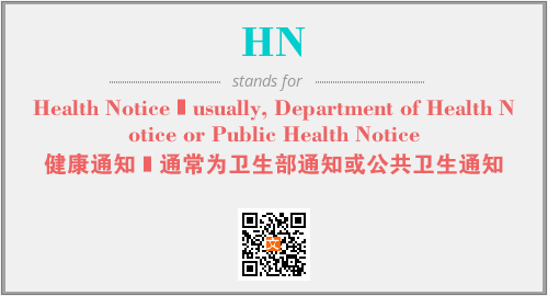 上述内容是“Health Notice–usually, Department of Health Notice or Public Health Notice”作为“HN”的缩写,解释为“健康通知–通常为卫生部通知或公共卫生通知”时的信息,以及英文缩略词HN所代表的英文单词,其对应的中文拼音、详细解释以及在英文中的流行度和相关分类、应用领域及应用示例等。