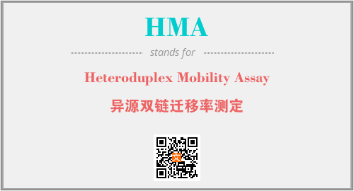 上述内容是“Heteroduplex Mobility Assay”作为“HMA”的缩写,解释为“异源双链迁移率测定”时的信息,以及英文缩略词HMA所代表的英文单词,其对应的中文拼音、详细解释以及在英文中的流行度和相关分类、应用领域及应用示例等。
