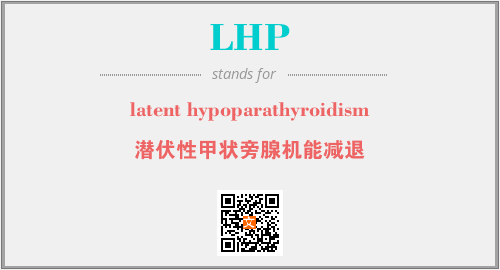 上述内容是“latent hypoparathyroidism”作为“LHP”的缩写,解释为“潜伏性甲状旁腺机能减退”时的信息,以及英文缩略词LHP所代表的英文单词,其对应的中文拼音、详细解释以及在英文中的流行度和相关分类、应用领域及应用示例等。