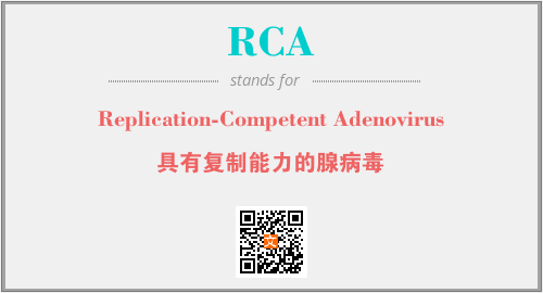 上述内容是“Replication-Competent Adenovirus”作为“RCA”的缩写,解释为“具有复制能力的腺病毒”时的信息,以及英文缩略词RCA所代表的英文单词,其对应的中文拼音、详细解释以及在英文中的流行度和相关分类、应用领域及应用示例等。