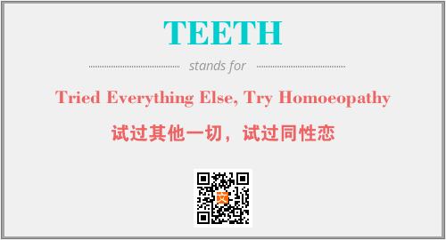 上述内容是“Tried Everything Else, Try Homoeopathy”作为“TEETH”的缩写,解释为“试过其他一切,试过同性恋”时的信息,以及英文缩略词TEETH所代表的英文单词,其对应的中文拼音、详细解释以及在英文中的流行度和相关分类、应用领域及应用示例等。