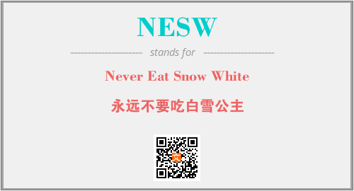 英文缩略词“NESW”经常作为“Never Eat Snow White”的英文缩写来使用,中文表示:“永远不要吃白雪公主”。本文将详细介绍英文缩写词NESW所代表英文单词,其对应的中文拼音、详细解释以及在英语中的流行度。此外,还有关于缩略词NESW的分类、应用领域及相关应用示例等。