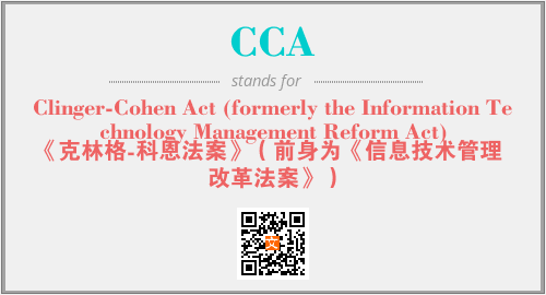 上述内容是“Clinger-Cohen Act (formerly the Information Technology Management Reform Act)”作为“CCA”的缩写,解释为“《克林格-科恩法案》(前身为《信息技术管理改革法案》)”时的信息,以及英文缩略词CCA所代表的英文单词,其对应的中文拼音、详细解释以及在英文中的流行度和相关分类、应用领域及应用示例等。