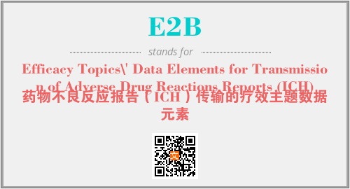 英文缩略词“E2B”经常作为“Efficacy Topics\' Data Elements for Transmission of Adverse Drug Reactions Reports (ICH)”的英文缩写来使用,中文表示:“药物不良反应报告(ICH)传输的疗效主题数据元素”。本文将详细介绍英文缩写词E2B所代表英文单词,其对应的中文拼音、详细解释以及在英语中的流行度。此外,还有关于缩略词E2B的分类、应用领域及相关应用示例等。