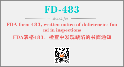 上述内容是“FDA form 483, written notice of deficiencies found in inspections”作为“FD-483”的缩写,解释为“FDA表格483,检查中发现缺陷的书面通知”时的信息,以及英文缩略词FD-483所代表的英文单词,其对应的中文拼音、详细解释以及在英文中的流行度和相关分类、应用领域及应用示例等。