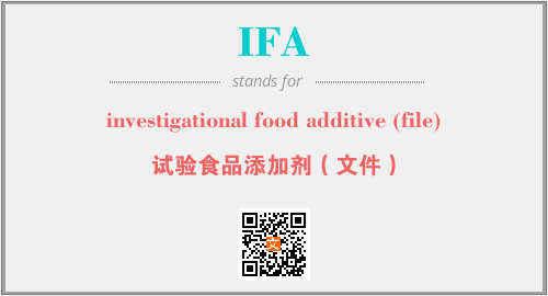 上述内容是“investigational food additive (file)”作为“IFA”的缩写,解释为“试验食品添加剂(文件)”时的信息,以及英文缩略词IFA所代表的英文单词,其对应的中文拼音、详细解释以及在英文中的流行度和相关分类、应用领域及应用示例等。