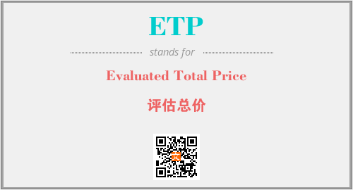 英文缩略词“ETP”经常作为“Evaluated Total Price”的英文缩写来使用,中文表示:“评估总价”。本文将详细介绍英文缩写词ETP所代表英文单词,其对应的中文拼音、详细解释以及在英语中的流行度。此外,还有关于缩略词ETP的分类、应用领域及相关应用示例等。